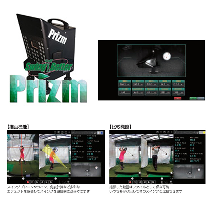 弾道測定器Prizmでは、前方と横方向からの映像をスローモーションで確認することができ、さらにインパクト付近のクラブヘッドの動きを映像で確認することができます。飛距離やスピン量などの数値も測れます。